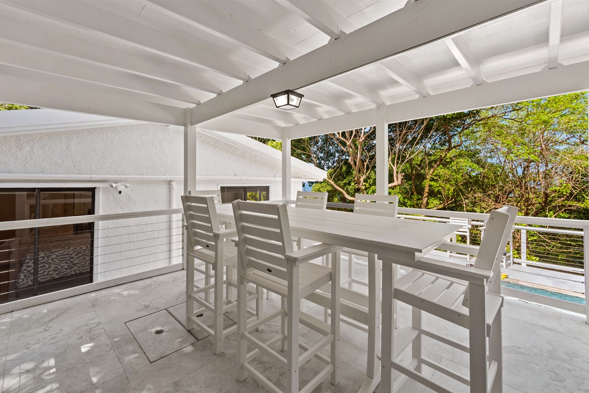 - Indoor dining + outdoor dining on covered porch next to pool