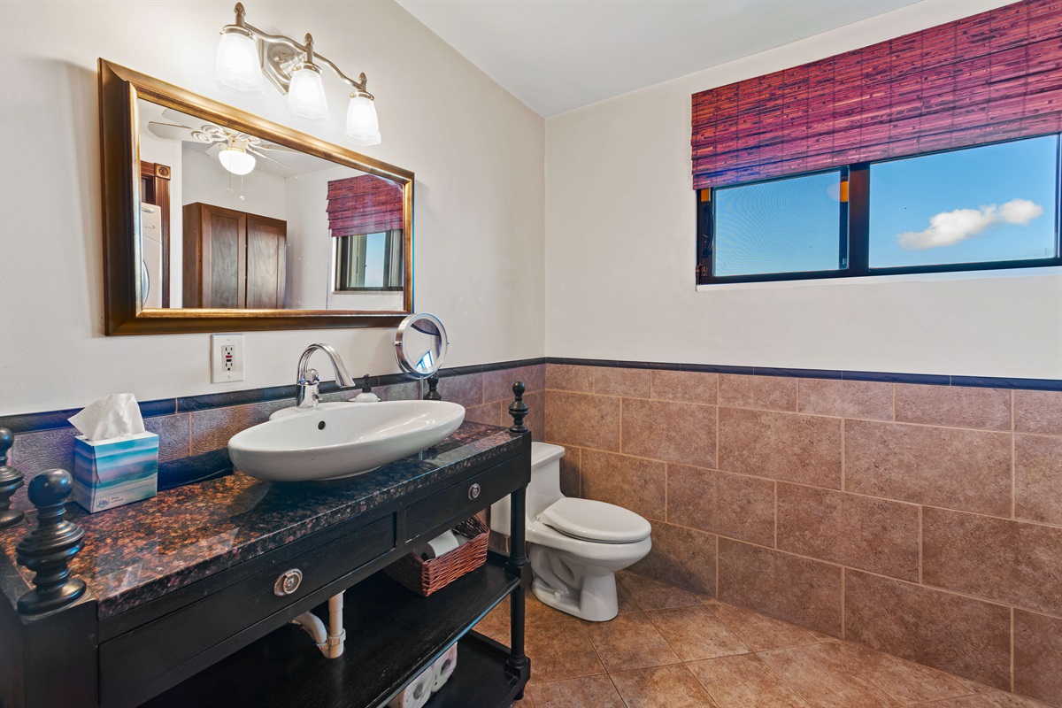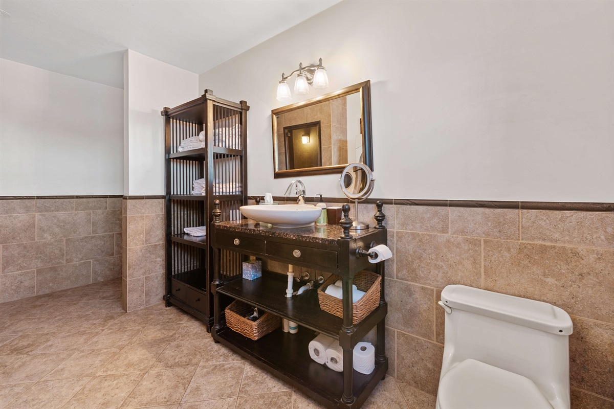 • The second guest bedroom is located inside the villa next to the stairs that lead up to the game room. It includes a king bed and a full bathroom with a walk-in shower.